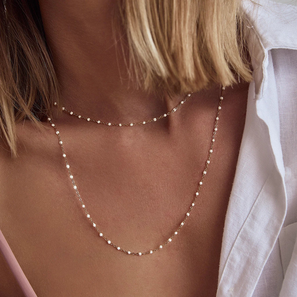 Stacking dreams are made from the gorgeougly elegant Peggy Necklace. A simple dainty chain, featuring on trend enamel beads throughout, the Peggy Necklace is the versatile piece for all occassions. Featuring a 20cm chain extension, it can be worn as a short choker style necklace with a long back chain (perfect for an open back top) or wear it as an extra long stacking necklace for an elegant look.