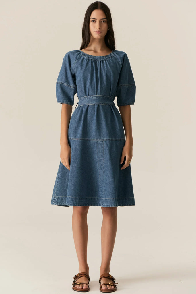 P O LThe Carsen Denim Dress features a reversible design and a tie belt to cinch in at the waist. It has a wide round neckline with topstitch detailing - flat at the front with gathering over the shoulders.