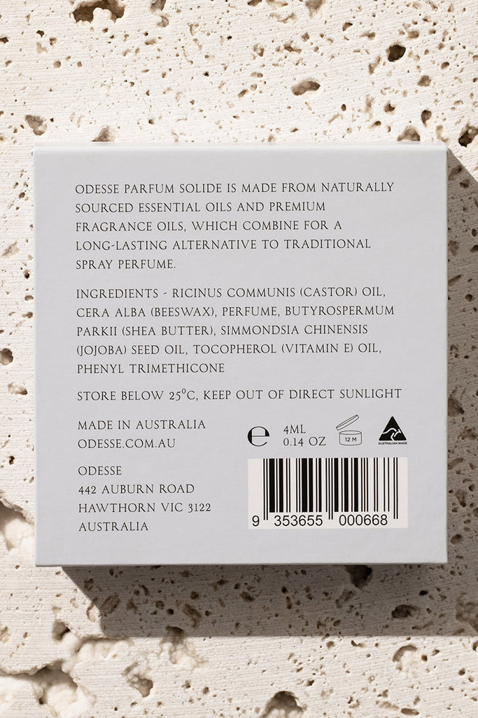 OdesseOdesse Parfum Solide is a wax based, Pocket-sized fragrance. Odesse blends the highest quality Australian native ingredients to create fragrances that are longer-lasting, more affordable and kinder to the planet than traditional spray perfume.