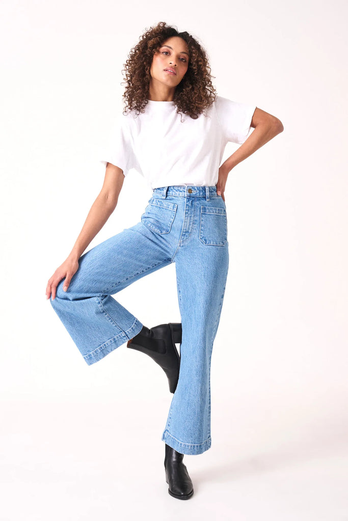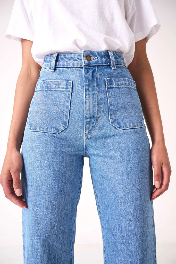 Rolla'sThe Sailor Jean has a flattering high rise and front facing Sailor style pockets. The leg profile opens out into a relaxed knee and wide hem. This fabrication has been through a washing process to create a 'worn in' look.