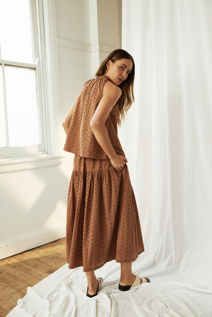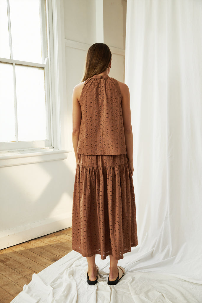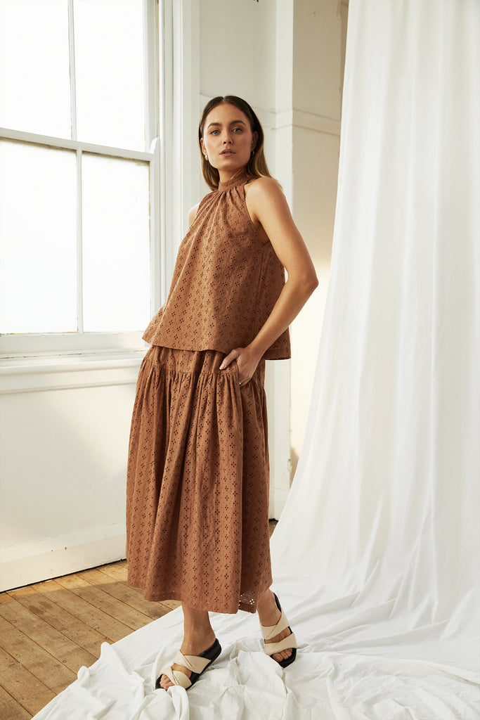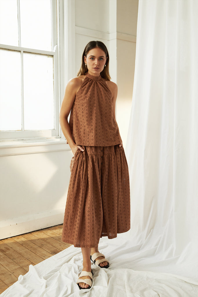 Mon RennHigh neck halter top made from a soft broderie anglaise.