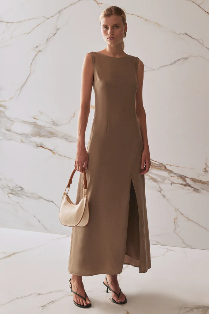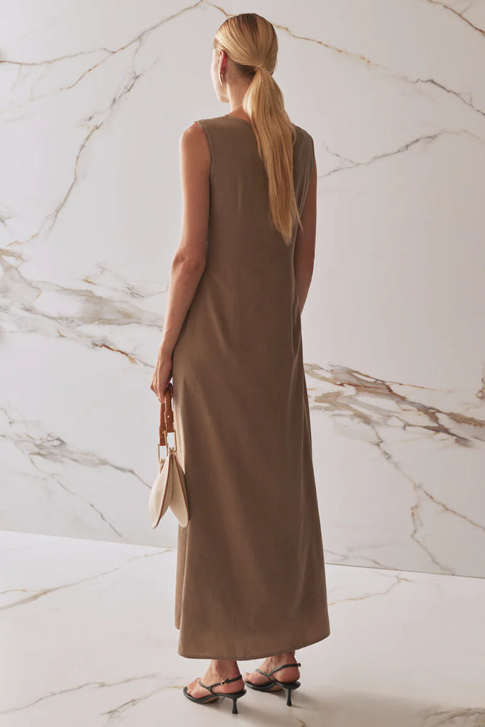 SanciaThe Andira Dress is designed with everday in mind. Perfect for the office or a casual outing, this maxi style has contrast edges and an overlapping panel to effortlessly elongate the body. Style with loafers or a sandal for everyday wear.