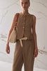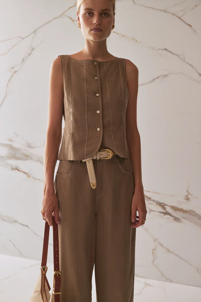 SanciaWe love a vest style top. Sophisticated to perfection, the Klara Vest features a boat neckline and wide set straps. The panel lines of this garment are designed to sweep beautifully down the waist and brush over the top of the hips. Pair with the Trista Shorts for a chic outfit.
