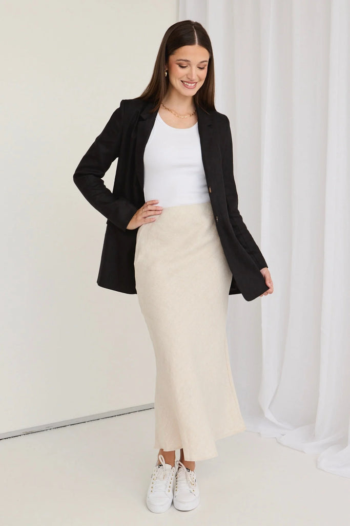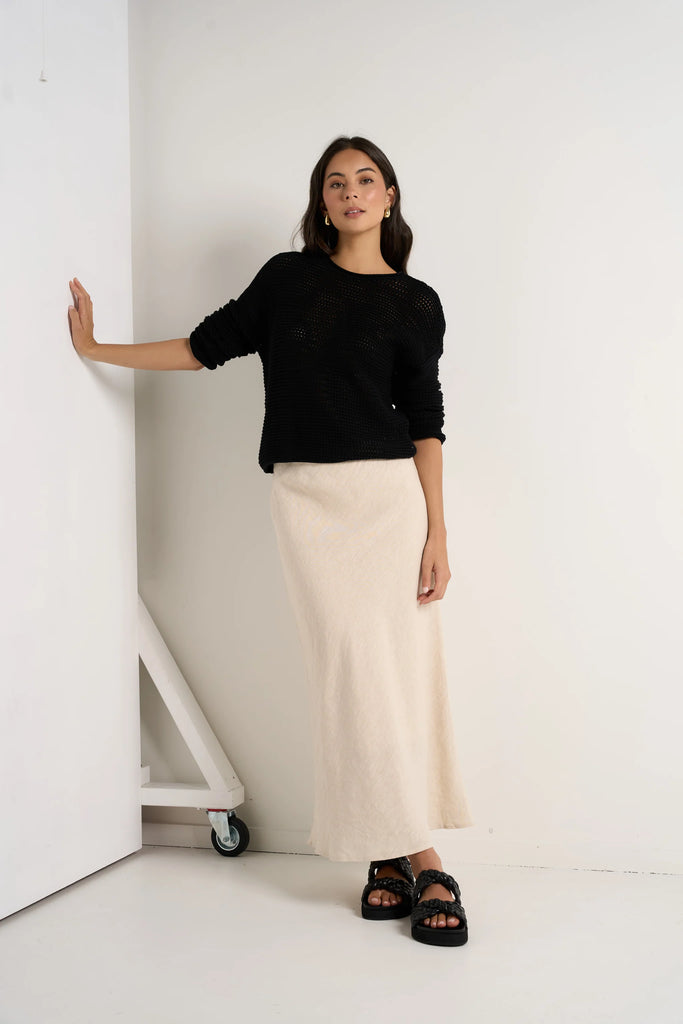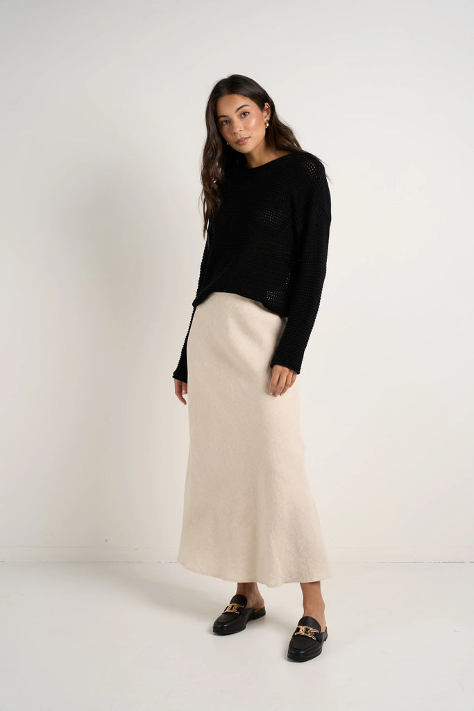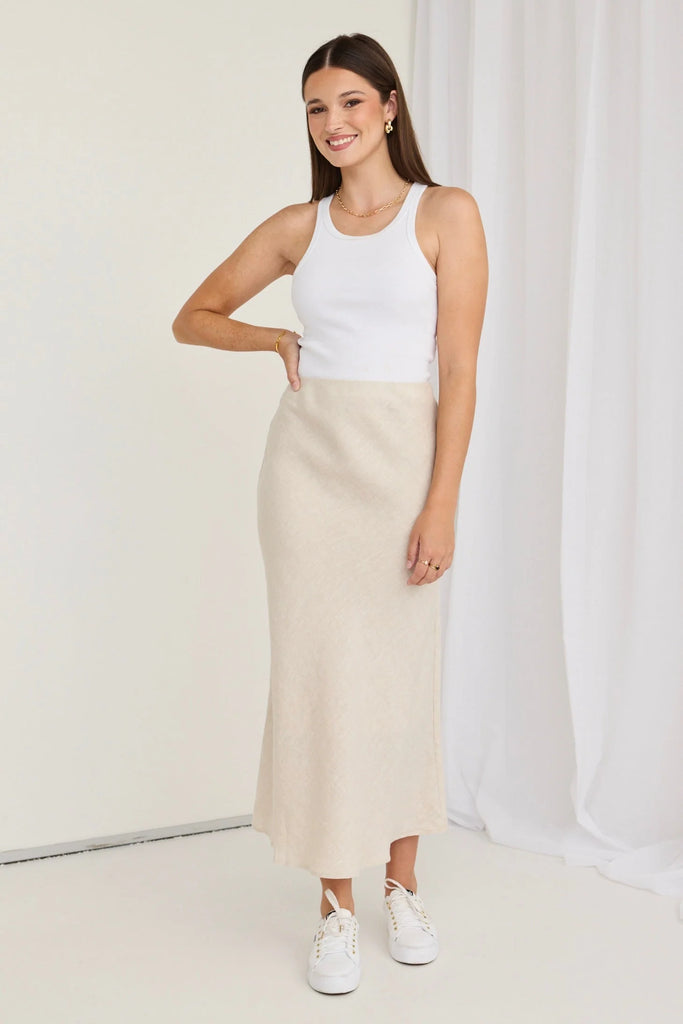 Re:Union LabelThe Bliss Linen Bias Midi Skirt is your go-to piece for everyday styling. The bias cut ensures a flattering, fluid silhouette that moves gracefully. With an elasticated waistband and pull-on design, it's as comfortable as it is chic. The plain design allows it to be paired with printed or solid colour tops. Dress it up with heels and a blouse or keep it cool with sneakers and a tee.