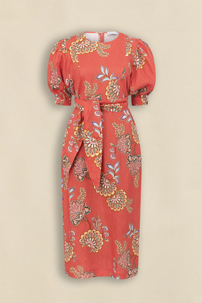 Zoe KratzmannCrafted in linen, the Wander Dress offers structure and softness in equal measure. In a chic vacation print that layers tonal florals over a warm melon hue, designed for effortless resort-to-city wear. With a neat fit and clean lines, it brings ease and elegance to everyday outfitting.