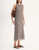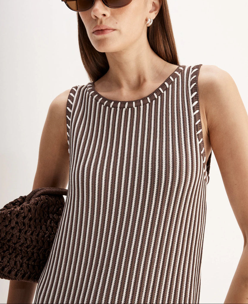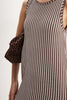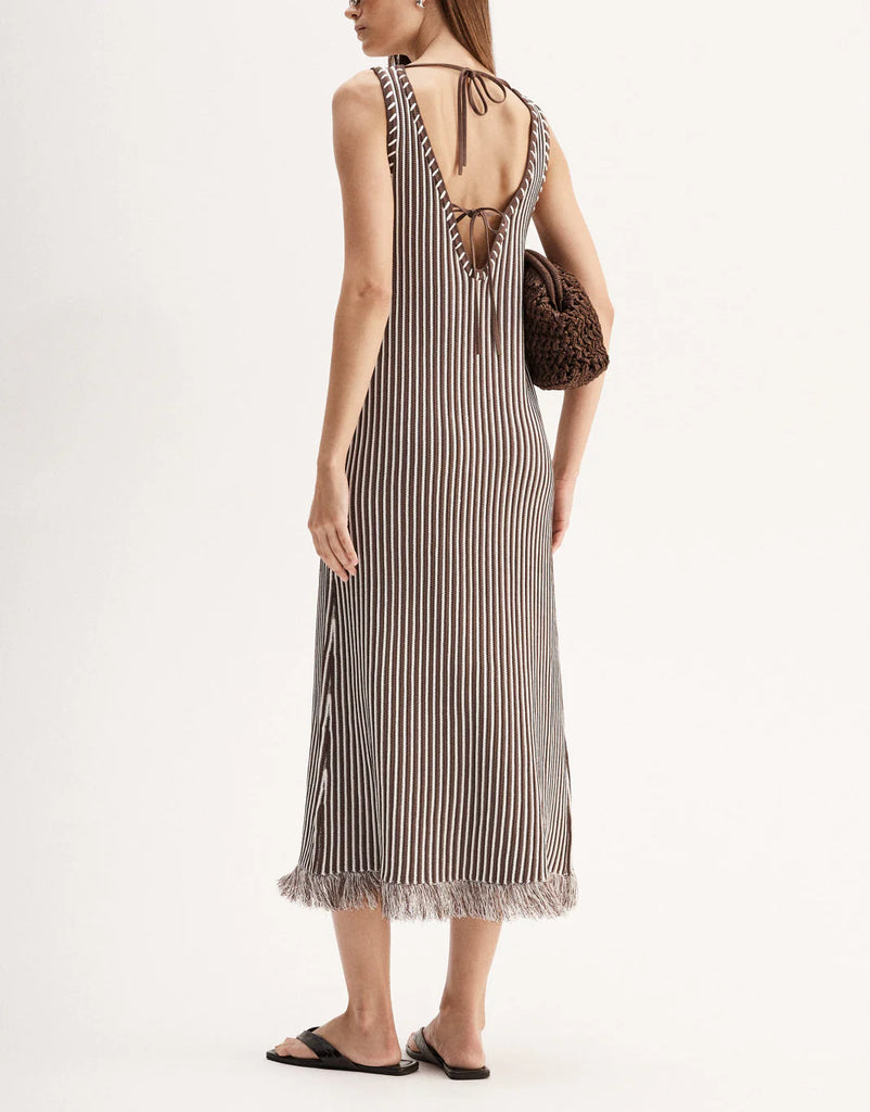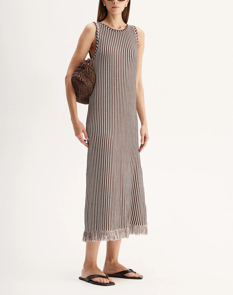 Elka CollectiveIntroducing Elka Collective's Alessandra Maxi Dress in Chocolate Stripe, a sleeveless knit maxi dress. Designed with a round neckline and a relaxed silhouette, this stripe maxi dress falls effortlessly to an ankle-grazing length. Vertical chocolate and ivory stripes elongate the form, while the fringed hem adds texture and movement.