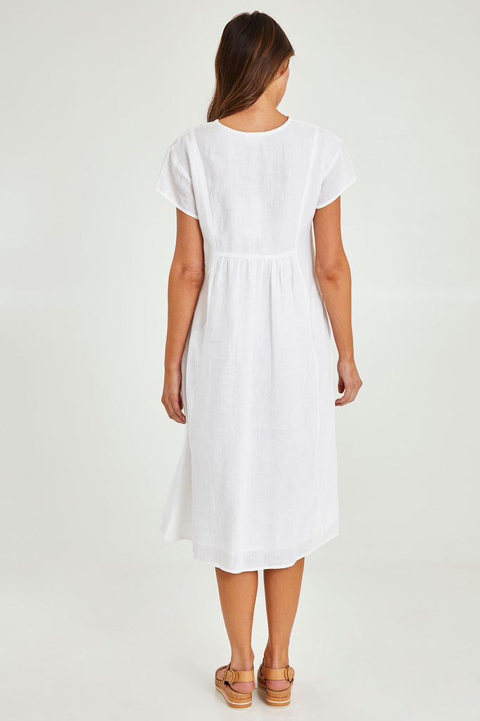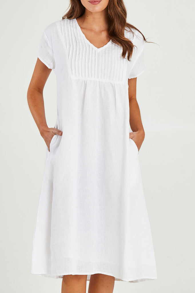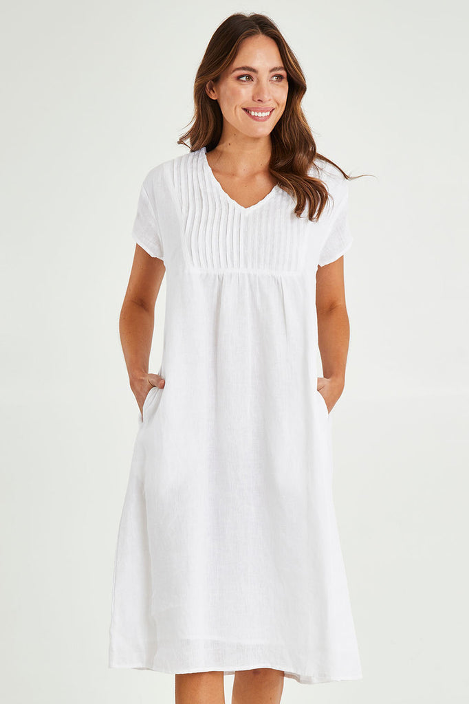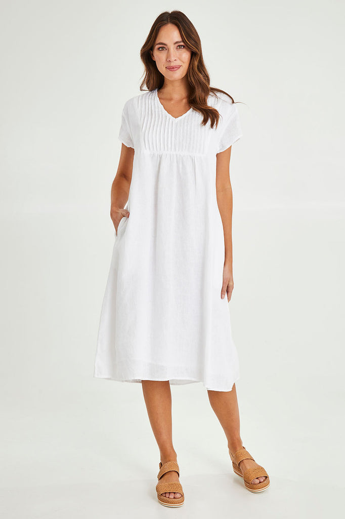 Holiday CollectiveThe Alfreco Dress is made from a soft 100% linen and lined with 100% cotton. It features pintuck detail on the front, a short sleeve and falls softly to a flattering length. This dress will let your body breathe even on the hottest days of summer. Pair with a sun hat and sandals and your set for the day.