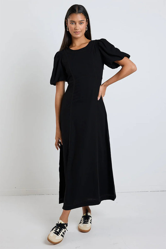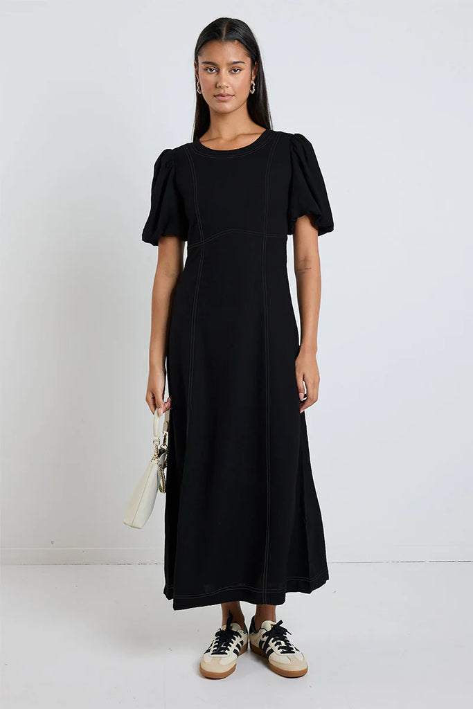 Expertly crafted with a blend of linen, this midi dress features puff sleeves for a modern touch. Lightweight and versatile, it's the perfect addition to your summer wardrobe. With a shirred back for a flexible and comfortable fit, this dress also features a gorgeous back cut out. Feel confident and comfortable in this stylish black dress, perfect for any occassion.